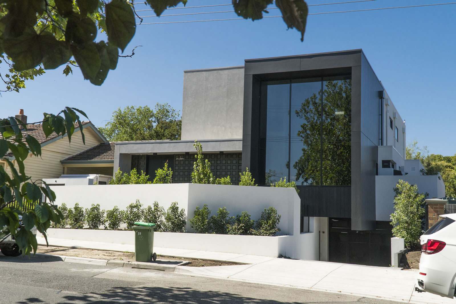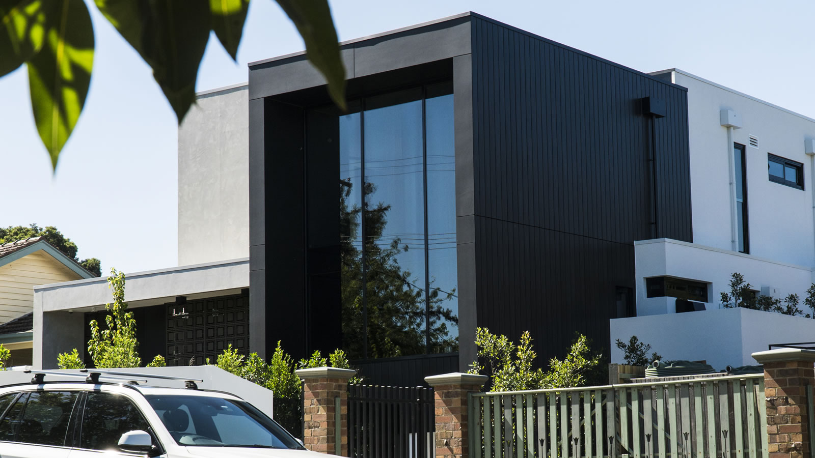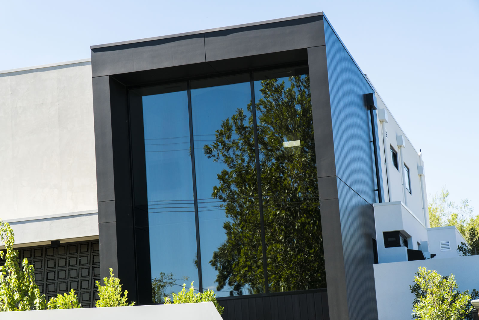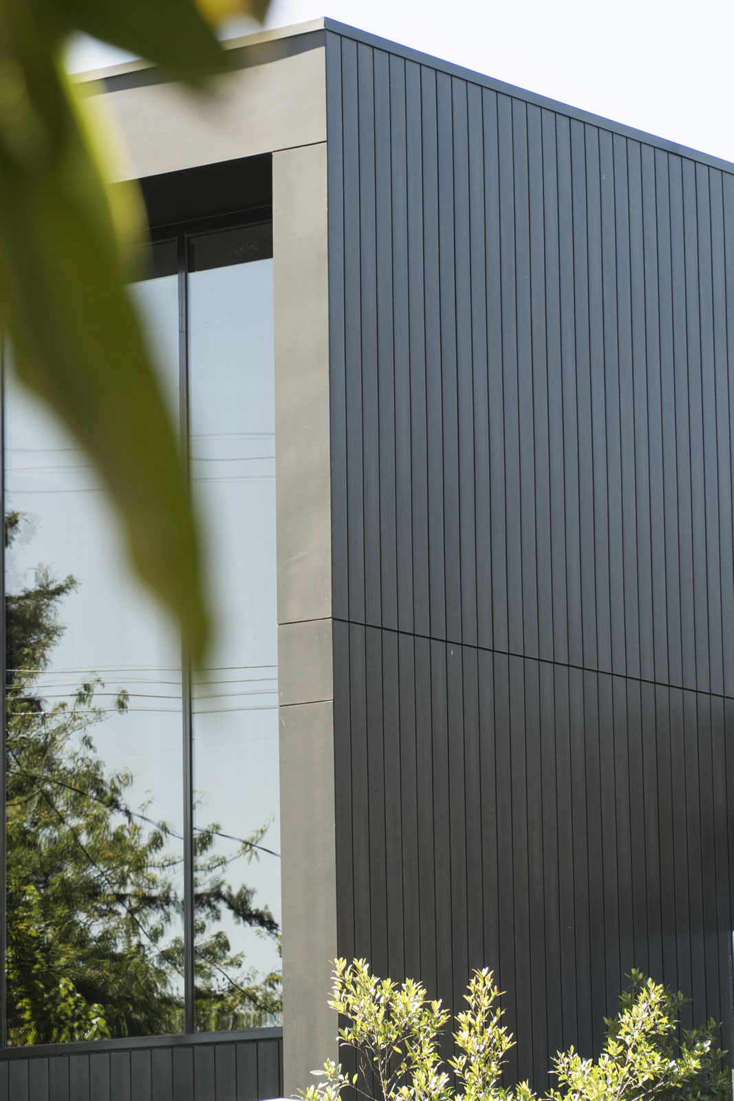 语句功能是前面的巨大黑色框架,使用欧洲塞莱克塔在非洲乌木。靠苍白水泥薄片,它展示了巨大的镜面窗,反映附近的树木:聪明地致敬的绿色,家庭友好的邻居。