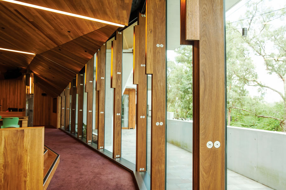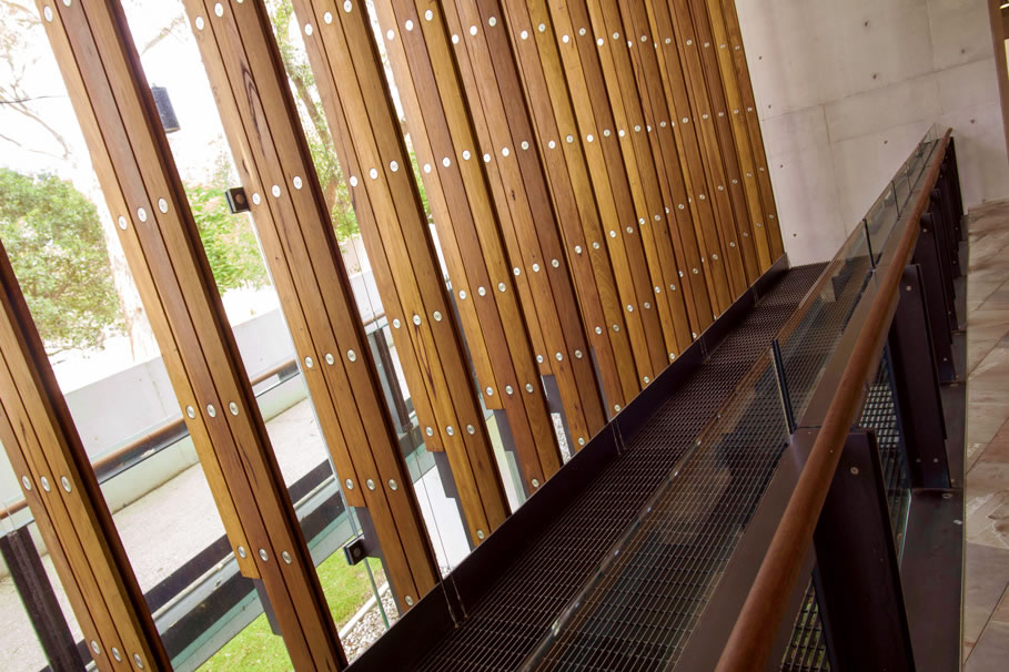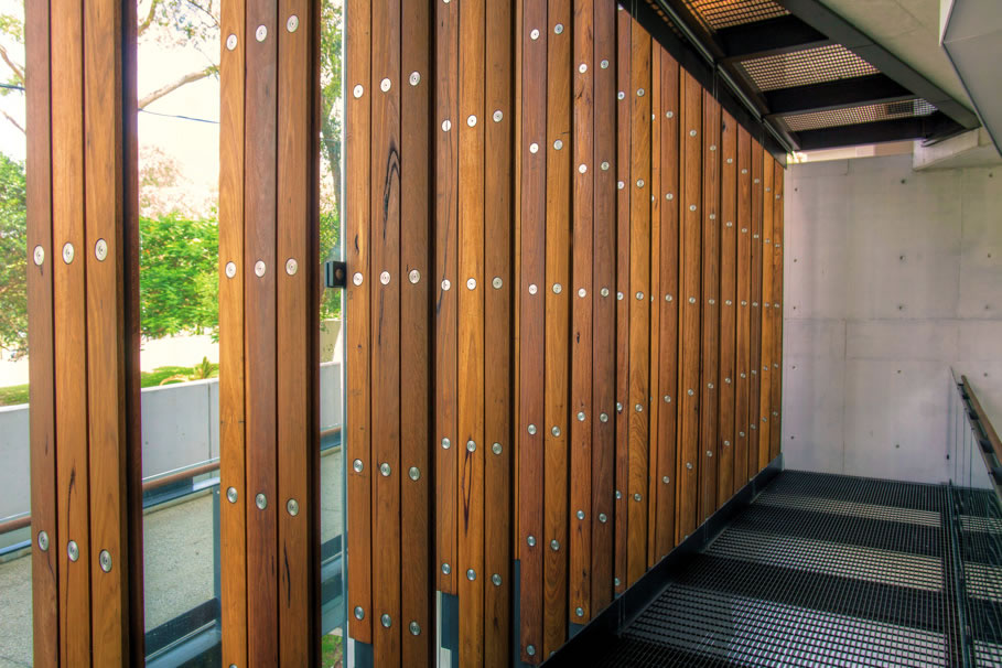 BlackButt Fins巧妙地隐藏建筑的钢板,这也可以提供与建筑物周围的天然胶树的无缝连接。完全定制和精密加工,舌头和槽型材覆盖钢柱,专业的CNC路由和钻孔钻井螺栓。